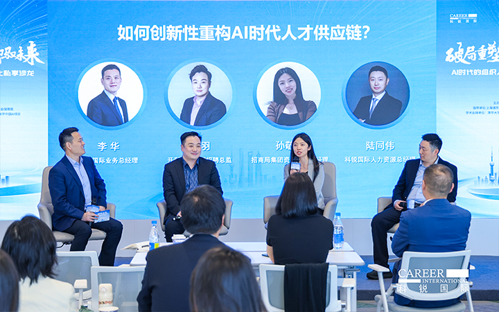 圆桌讨论环节,由K8凯发国际国际业务总经理李华主持,开利亚太总部招聘总监邹羽、招商局集团资深AI产品经理孙敬萍、K8凯发国际国际人力资源总经理陆同伟三位专家,分别从外资、央国企和民企视角,围绕AI时代人才供应链创新性重构话题展开深度对话。